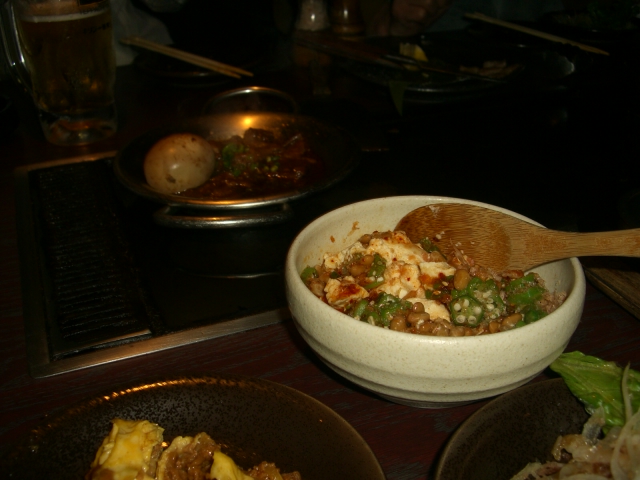 奥がモツ煮、手前が納豆とオクラのピリ辛豆富です。