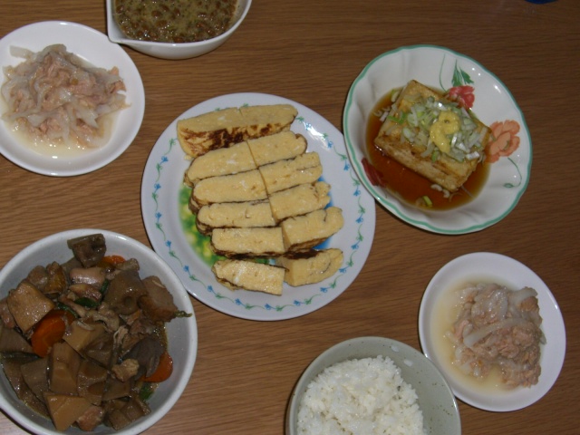 厚焼き玉子、筑前煮、なんちゃって揚げ出し豆腐