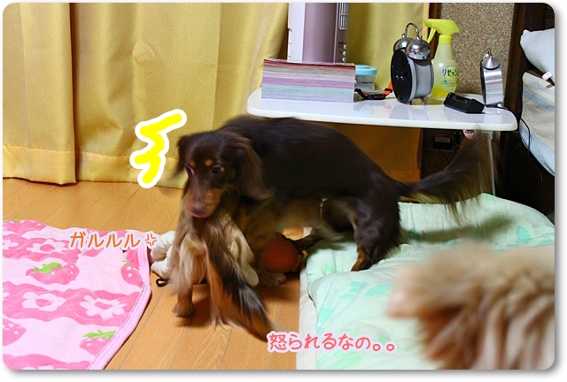 もみ様は見えていないのに、「こえは黒ダックスじゃねぇでつ!」と拒否。