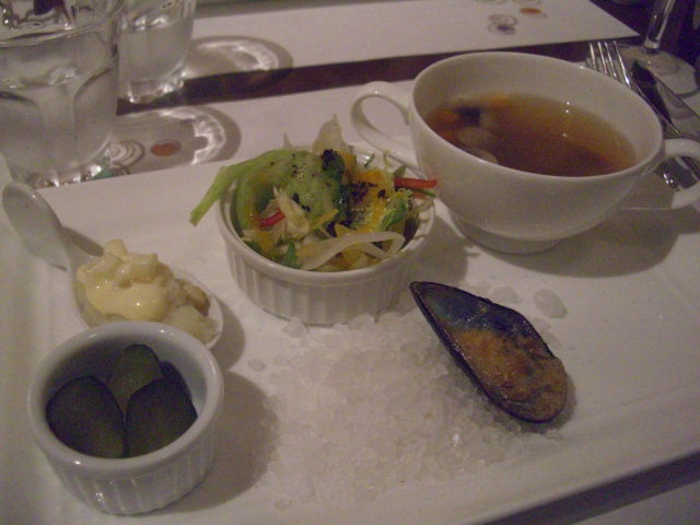 アロエ&くこ?の実入りのスープ、サラダ、何とか貝の焼き物、マッシュポテト、ピクルス。