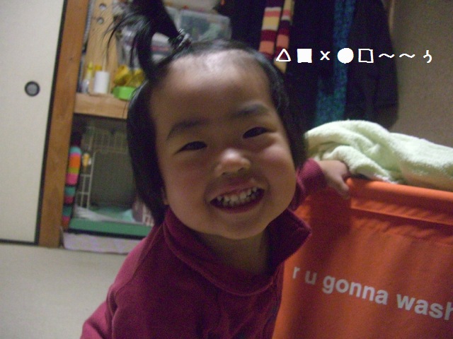 脱衣所で固まるむしこ!ヤバイと思ったんだろうなぁ~ちゃんと入れ物は立てていた