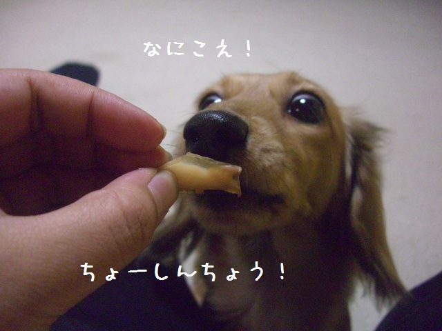 あたちは初めて食べるもにょには、超真剣に様子を伺うんでつ♪