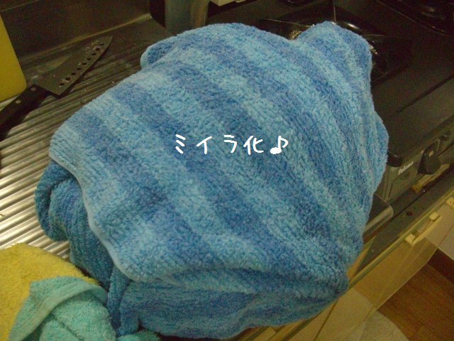 バスタオルがデッカイものを包んで、台所においてありゅんでつけど・・・・。