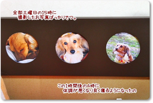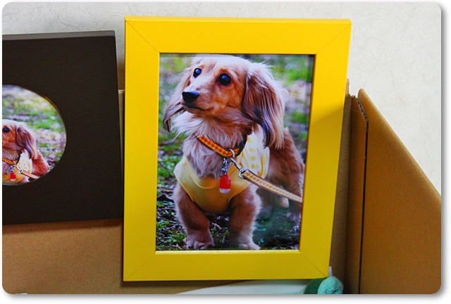 もーちゃんが寝ているダンボールには写真もかけてあります。