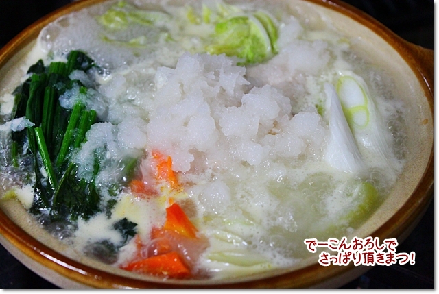 全体的に火が通ったら、でーこん(大根)おろしを入れてそのまま頂きまつた。