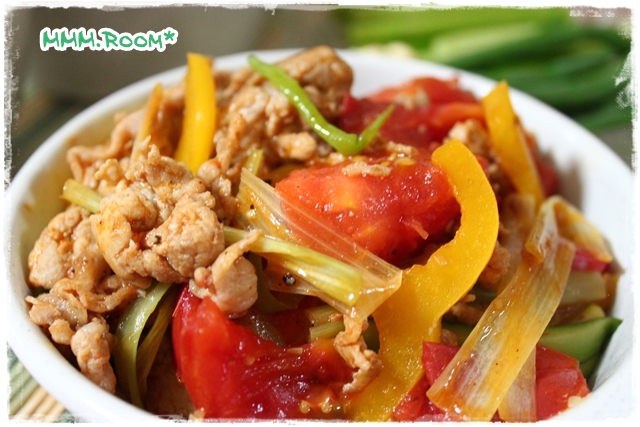 頂いたトマトは豚肉、パプリカ、ネギ、ズッキーニと野菜炒めにしまつた!