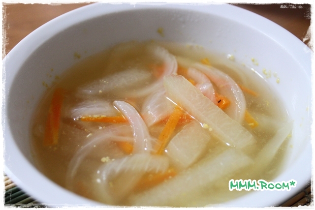 頂いた玉ねぎは冬瓜(とうがん)、人参と鶏ガラスープにしまつた♪