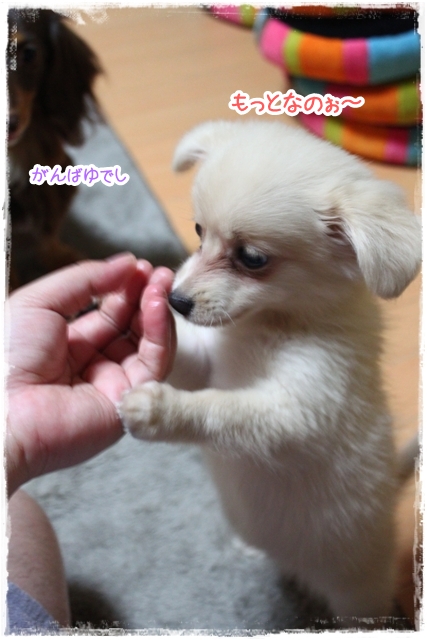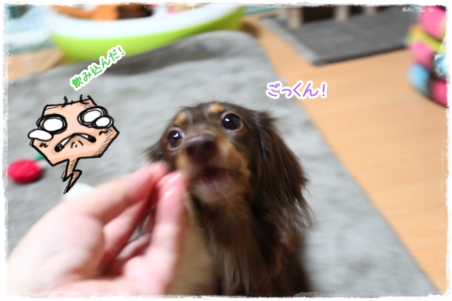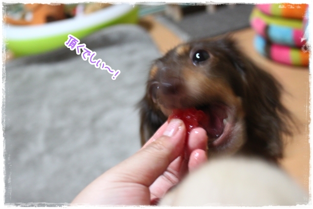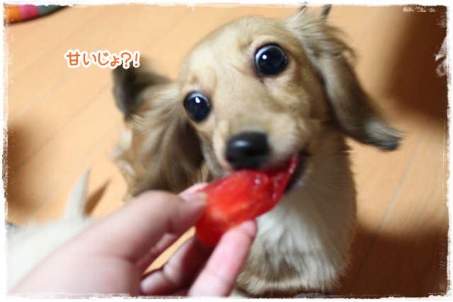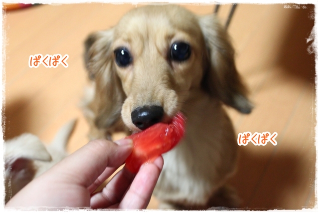 最初クンクン念入りにしておったけろ、パクっと食いついたらビックリ顔!