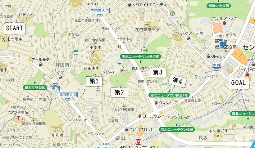 右に行けば港北ニュータウン第4緑道で仲町台の近くへ。