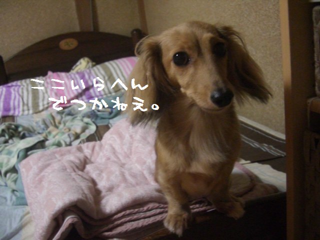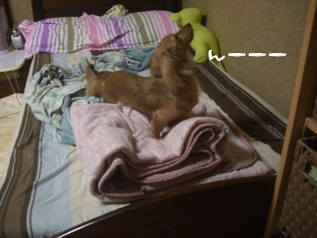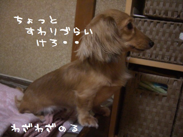 ベットの際より少し離しておいたのに、わざとタオルケトに腰掛け、