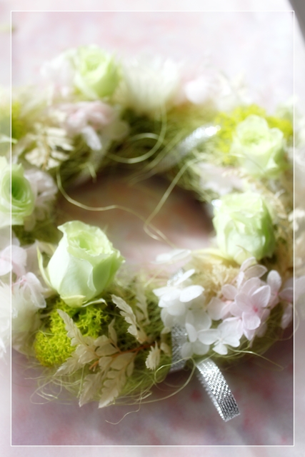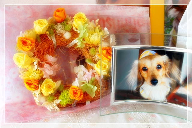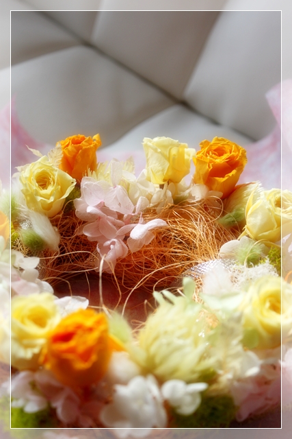 オレンジと黄色の小さな薔薇のブリザードリースを買ったよ。