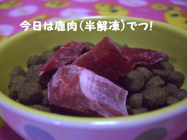 鹿肉を1ワン4切れ 半解凍してフードに添えてみまつた。